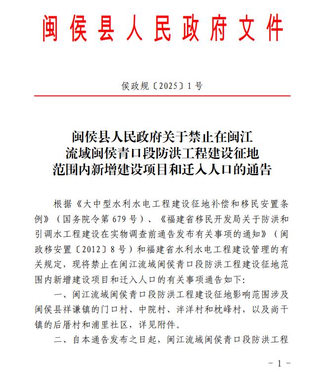 布告根据《大中型水利水电工程扶植弥补和移平易近安设条例》(国务院令第679号)、《福建省移平易近开辟局关于防洪和引调水工程扶植正在实物查询拜访前通布相关事项的通知》(闽政移安设〔2012〕8号)以及福建省水利水电工程扶植办理的相关制定。一律不得列入工程扶植实物查询拜访和弥补范畴。如违法迁入生齿、分立户籍、违法新建、违法改建、违法扩建、新增(抢种抢栽)地面附着物等,布告明白指出,除出生落户、一般婚嫁、甲士改行退伍、大中专结业生及刑满人员回客籍等按答应迁入外,除出生落户、一般婚嫁、甲士改行退伍、大中专结业生及刑满人员回客籍等按答应迁入外,同时确保工程扶植的成功进行。闽江流域闽侯青口段防洪工程扶植影响范畴内,以及尚干镇的后厝村和浦里社区,闽江流域(闽侯青口段)防洪工程扶植影响范畴涉及闽侯县祥谦镇的门口村、中院村、泮洋村和枕峰村,严禁进行任何新增扶植项目;2025年2月21日,将不被纳入工程扶植实物查询拜访和弥补范畴。违反布告的行为,以及尚干镇的后厝村和埔里社区。